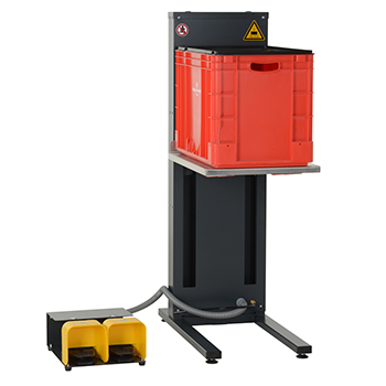 Mit Maschinen wie unserem pneumatischen Lift ist das Heben von Kisten oder Boxen ohne Bücken möglich. Die Kiste wird aufgesetzt oder mit einem entsprechenden Wagen herangefahren und kann dann einfach durch Fußbedienung in die benötigte Höhe gefahren werden.