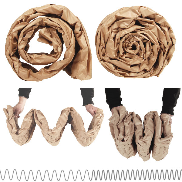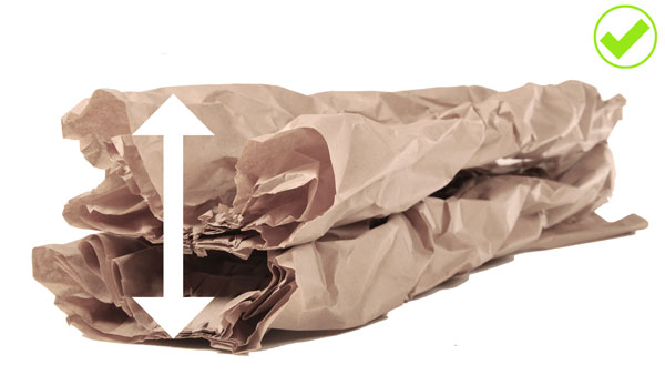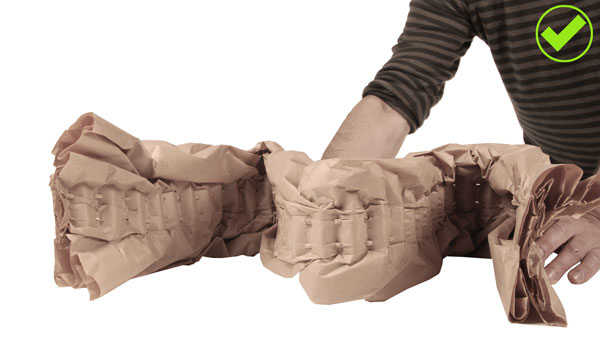 Die Papierpolster können ihre Polsterwirkung nur dann richtig entfalten, wenn sie richtig genutzt werden. Dabei ist wichtig, dass Sie die Festigkeit der „Welle“ in der Polster-Mitte richtig verwenden. Für kleine Zwischenräume nutzen Sie flache Papierpolster.
