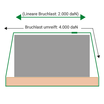 Ein Umreifungsband mit einer linearen Bruchlast von 2.000 daN hält umreift ungefähr doppelt so viel aus, nämlich bis zu 4.000 daN (4.000 kg).