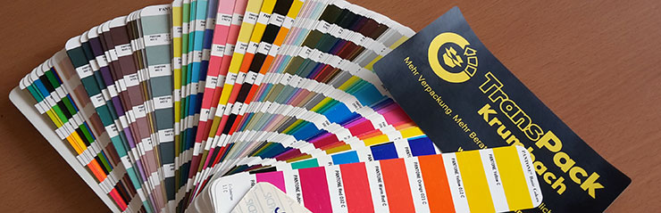 HKS- und Pantone-Farbtöne sind hingegen bereits „vorgemischte" Sonderfarben und Farben, die sich im CMYK nicht mischen lassen. Jeder Farbton, zum Beispiel das Gelb im TransPack-Krumbach Logo, entspricht einem genau festgelegten Pantone-Wert. Beim Druck von Pantone-Farben wird also gewährleistet, dass immer exakt der gewünschte Farbton gedruckt wird, was vor allem beim Druck von Firmenlogos und Schriftzügen besonders wichtig ist.