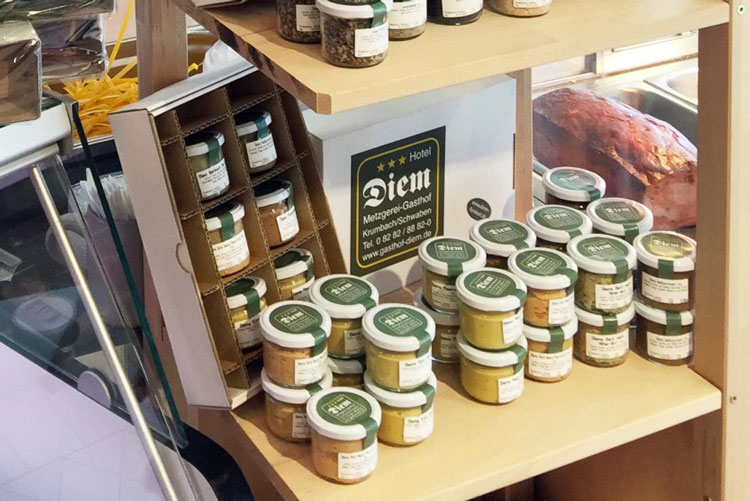 Kreative Produkte fordern kreative Verpackung. Denn das Produktsortiment vom Hotel, Restaurant & Metzgerei Diem ist alles andere als langweilig. Küchenchef Johannes Diem zaubert neben klassischer Feinkost u.a. auch kreative vegane Gerichte in Dosen für zuhause - erhältlich im Laden oder Onlineshop.