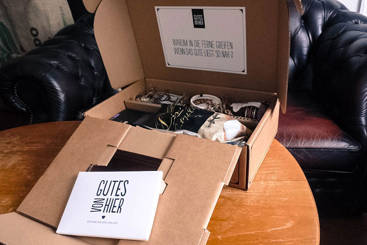 Nachhaltig und Lokal – dafür steht das Unternehmen „Gutes von Hier“. Mit unseren bedruckten Klappschachteln mit Einstecklaschen und Gefache haben wir eine passgenaue Verpackungs-Lösung für das bunte Sortiment an lokalen Manufakturprodukten gefunden. Für einen stabilen und sicheren Versand der hochwertigen Produkte werden mögliche Hohlräume mit farblich passenden Fillpack ausgefüllt.